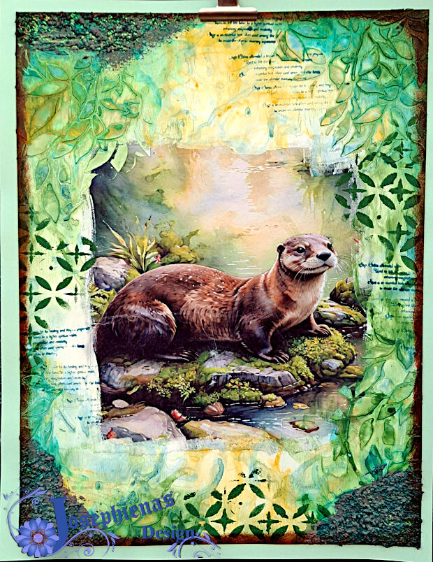 Er is iets magisch aan het transformeren van een eenvoudig vel papier tot een gelaagd en textuurrijk kunstwerk. Voor dit project gebruikte ik Josephiena’s Collage Paper “Wild Life 3” (CP-088) — met onze eigen handgeschilderde otter. Het motief is gedrukt op prachtig dun printerpapier, waardoor het eenvoudig uit te knippen, op te plakken en naadloos te laten opgaan in de achtergrond.