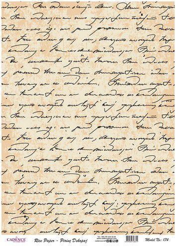 written text - Cadence ricepaperManufacturer: Cadence Art & Hobby paint SKU: CR0174 €2.75 Qty: Add to cart Ship toSelect countryBelgiumFranceLuxembourgNetherlandsUnited Kingdom *Other *Shipping MethodNameEstimated DeliveryPriceNo shipping optionsApply Custom wishlist OKAdd to wishlistAdd to compare listEmail a friendwritten text - Cadence ricepaperModel No: 174Rice paper from Cadence is A3 in size. The pasting is best done with a decopage glue.Product tags tekst (67), vintage (27), rijstpapier (12), ricepaper (17)